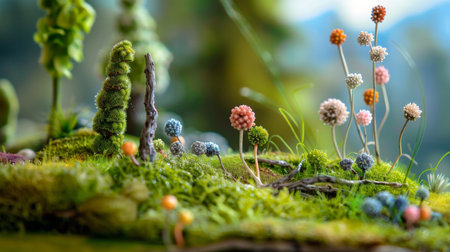 A captivating scene depicting miniature gardeners tending to a vibrant garden, showcasing a lush ecosystem filled with colorful flowers and greenery in a dreamlike setting.