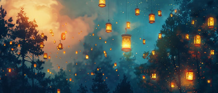 A captivating night scene featuring numerous illuminated lanterns suspended among silhouetted trees against a dreamy, ethereal sky. The warm glow of the lanterns creates a whimsical and mystical atmosphere, evoking a sense of wonder and tranquility in nature's embrace.