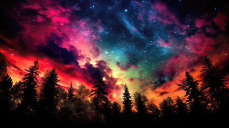 Fantastic colorful sky with stars and nebula in the forest (ai generated)