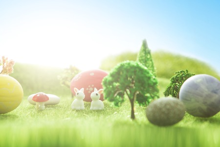 Easter rabbits toys with easter eggs on a green grass. Fairy tale sunset on the green field with grass, mushrooms and trees. Macro.