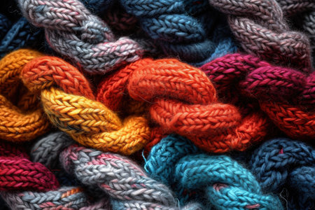 Multi colored woolen garments woven with intricate patterns for winter fashion generated by artificial intelligence