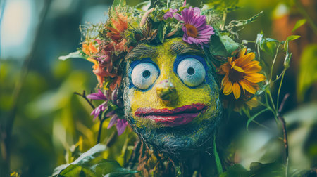 A whimsical figure crafted from branches and flowers is placed among vibrant plants showcasing creativity in a lush garden setting.