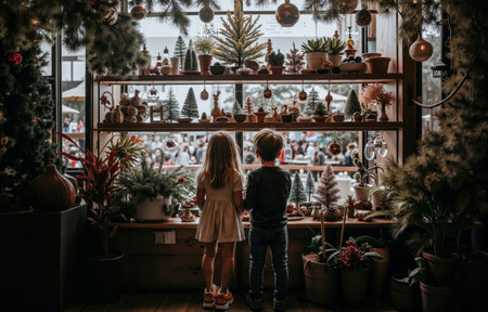 In the image there are two children standing in front of a large window that is adorned with various Christmas decorations