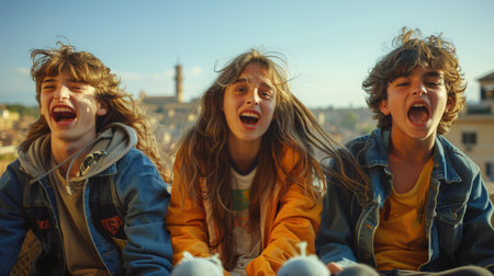 Two young adults enjoy a sunny day, sharing laughter as their wind-swept hair dances in the gentle breeze, embodying the joy of outdoor adventures and friendship.