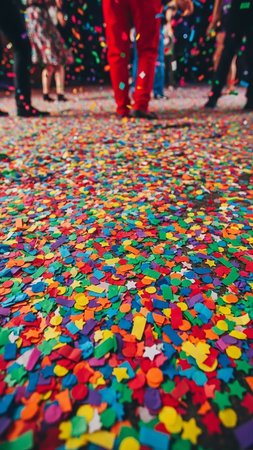 A low-angle view of a dance floor covered in a dense, vibrant scattering of colorful confetti with blurred figures celebrating in the background.