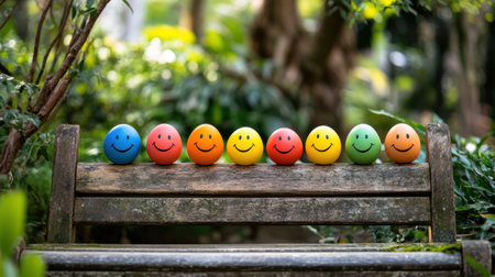 A row of colorful Easter eggs with smiley faces on a wooden bench