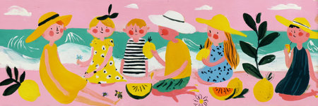 Friends gather on a sunny beach, sharing laughter and enjoying delicious fruits and drinks while soaking up the warm sun and vibrant atmosphere of summer