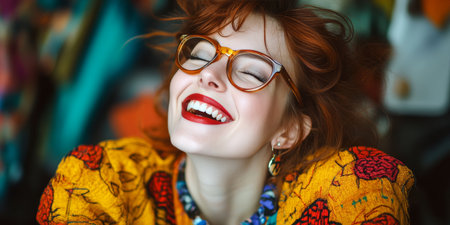 Portrait of Joyful Woman with Red Hair and Glasses, Her Infectious Smile Lights Up the Room