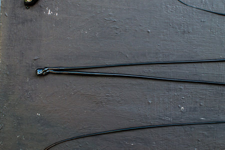 Two broken bare and rewound USB wires with duct tape on a monochrome background