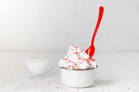White milk ice cream with red and pink sprinkles decoration and a red plastic spoon in a white metal mug on a white background