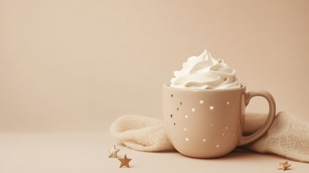 A cozy hot cocoa mug adorned with cream and tiny stars rests on a soft beige surface, creating a warm, inviting atmosphere perfect for chilly days.