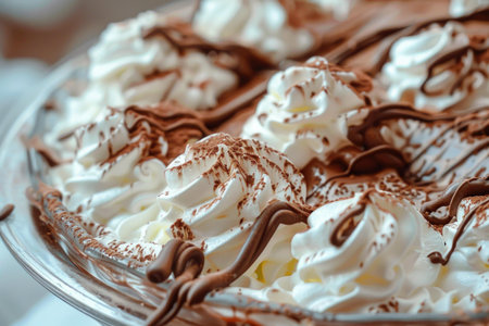 Closeup of scrumptious whipped cream peaks drizzled with rich chocolate syrup