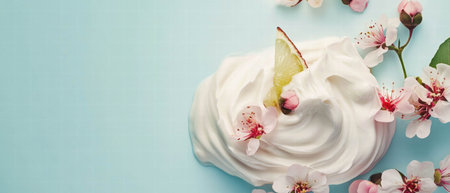 cream texture forming abstract patterns on a pale blue matte surface generative ai