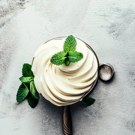 Vanilla sweet ice cream with mint ice cream spoon on a white stone background top view