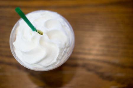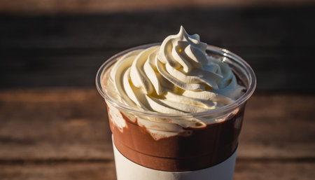 Close up of hot chocolate with whipped cream in plastic cup on wooden table