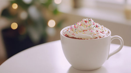 A cozy hot beverage served in a white cup, featuring whipped cream and colorful sprinkles, perfect for relaxation and enjoyment in a warm atmosphere.