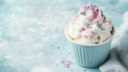 Soft serve ice cream swirled in a cup adorned with pastel sprinkles on a light blue background creates a playful and sweet treat.