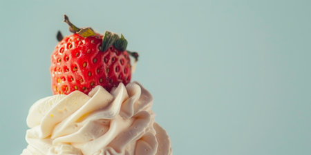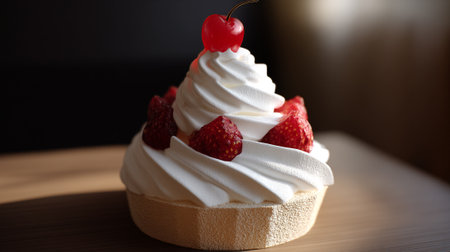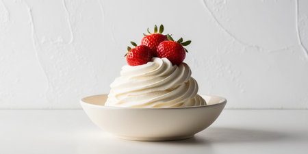 A delicious dessert with whipped cream and fresh strawberries on a wooden table