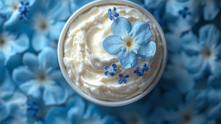 Creamy cosmetic product displayed with vibrant flowers against a soft blue backdrop