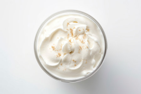 A captivating swirl of creamy white texture on a smooth surface, ideal for showcasing culinary delights, baking ingredients, or product promotions in food photography.