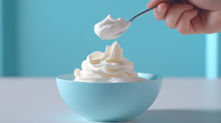 A whimsical shot of a hand holding a spoonful of whipped cream over a bowl.
