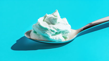 Abstract food photo of whipped pastel blue cream on spoon with shadows against bright backdrop