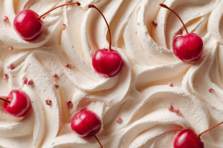 A close-up view showcases creamy whipped frosting with four cherries scattered on soft swirled buttercream in natural light. The high detail brings out the texture of this dessert.