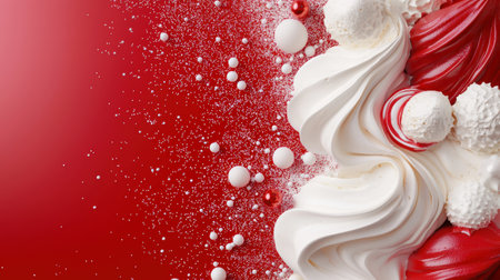 Soft and fluffy meringue is beautifully swirled with pink and white hues against a pink backdrop. Powdered sugar adds a touch of sweetness to the composition.