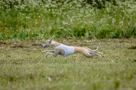 Whippet dog running in white jacket on coursing green field
