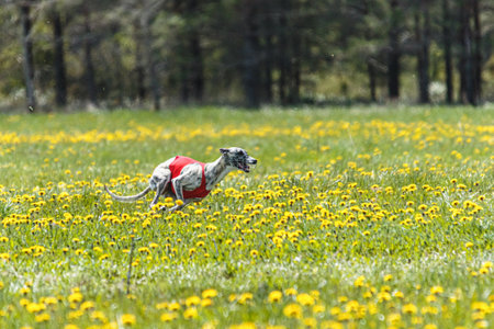 Whippet sprinter dog running and chasing on the field