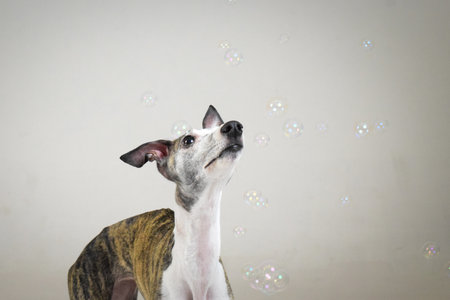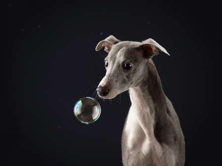 dog with soap bubbles on a black background. Funny whippet in the studio. Beautiful light