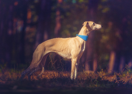Whippet dog in turquoise collar stays on forest background