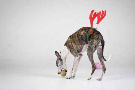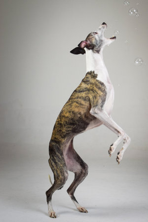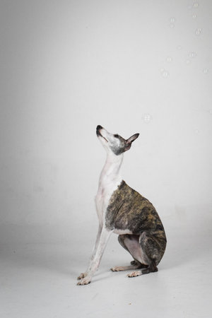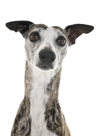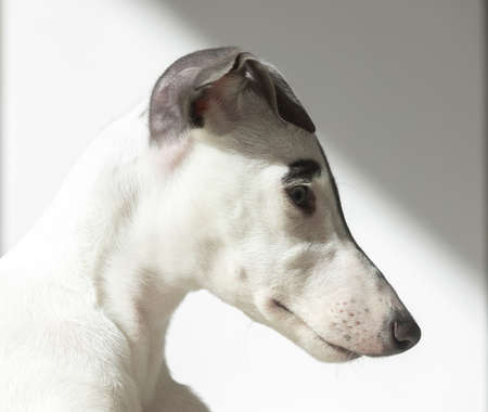 Whippet dog. Portrait on a white background in romantic studio