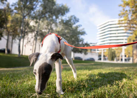 Cute pet whippet puppy in a park