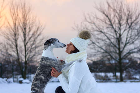Woman playing with her dog during winter sunset. Pet owner and whippet greyhound outdoors.