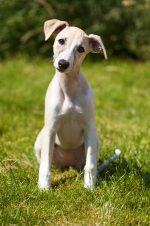 12 weeks old whippet puppy sitting on the lawn