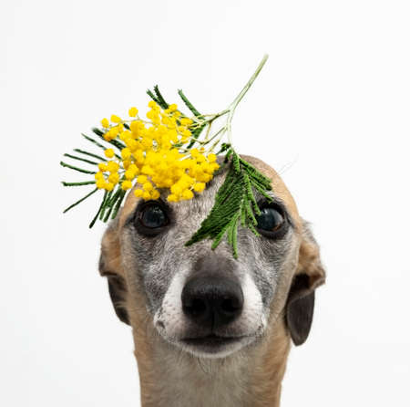 Fawn whippet with mimosa branch on its head
