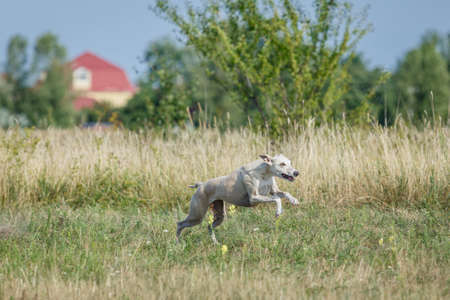 Whippet dog running. Coursing training. Dog running on the field. Sunny summer day