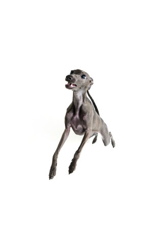 Funny puppy. Portrait with playful dog Italian greyhound posing and raising paws isolated over white studio background. Running in motion. Concept of care, animal life, health, vet, breed of animal