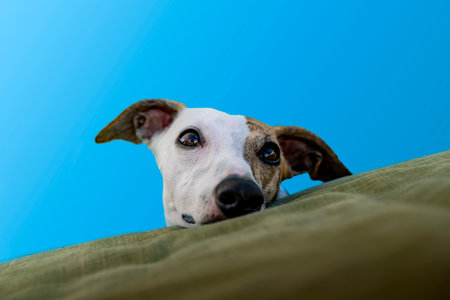 Whippet dog peeking playfully, showing curiosity and connection