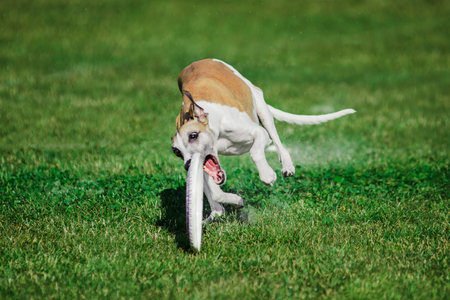 Whippet sprinter dog running and chasing lure on the field