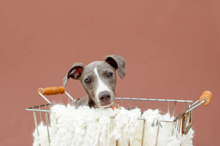 Puppy Italian Greyhound in a wire basket with a fluffy white blanket. Brown studio background.