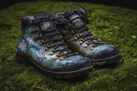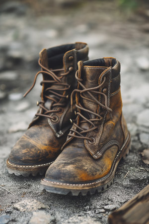 Old leather hiking boot undone, stained with mud and dirt generated by artificial intelligence