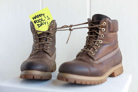 Pair of boots with laces tied together with a note with the phrase Happy Fool's Day.