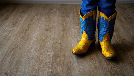 A person's legs are shown wearing colorful cowboy boots on a wooden floor.