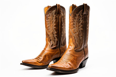 A pair of detailed brown leather cowboy boots with decorative stitching, presented on a clean white background.