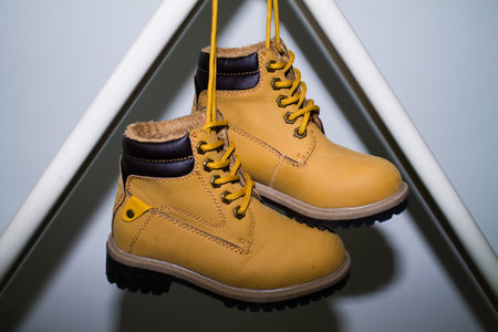 A pair of yellow work boots hanging by their laces against a light background. The boots feature a rugged design with a brown collar and black rubber soles.