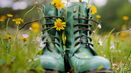 A pair of green boots adorns a vibrant field, surrounded by blooming wildflowers under soft sunlight. This image captures the essence of nature, adventure, and outdoor beauty. Perfect for themes of gardening and fashion.