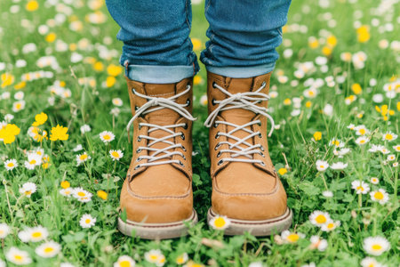 Person wearing brown leather boots standing on a flower covered meadow, embracing nature and adventure.