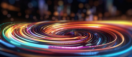 Illustration of a hypnotic spiral pattern made of thin, glowing neon lines against a dark background. The futuristic and dynamic design gives a sense of endless motion, making it perfect for modern digital art.